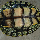 Description: Moderate sized turtle with an adult maximum shell length of 12.6 cm (4.9”) for males and 21.3 cm (8.3”) for females. The carapace is greenish brown and elliptical in dorsal view but rather flat in a lateral view. A slight mid-line keel is present and the second to fourth vertebral scutes are slightly elevated. The highest point of the carapace is the posterior edge of the second vertebral scute. The posterior marginal scutes are serrated. A cream colored transverse bar is present on the chin just behind the cusp and a crescent or ‘V’ shaped cream colored marking is usually present on the top of the head and between the eyes but in some specimens this is interrupted and appears as two separate blotches. The coloration of the flesh on the neck, limbs and tail is creamy yellow with dark colored stripes. The plastron and bridge are creamy yellow with brownish markings along the seams. Four longitudinal dark lines are present on the bridge. Asides from being smaller than the females, males have diminutive heads and the heads of females while noticeably larger are meso-cephalic.
